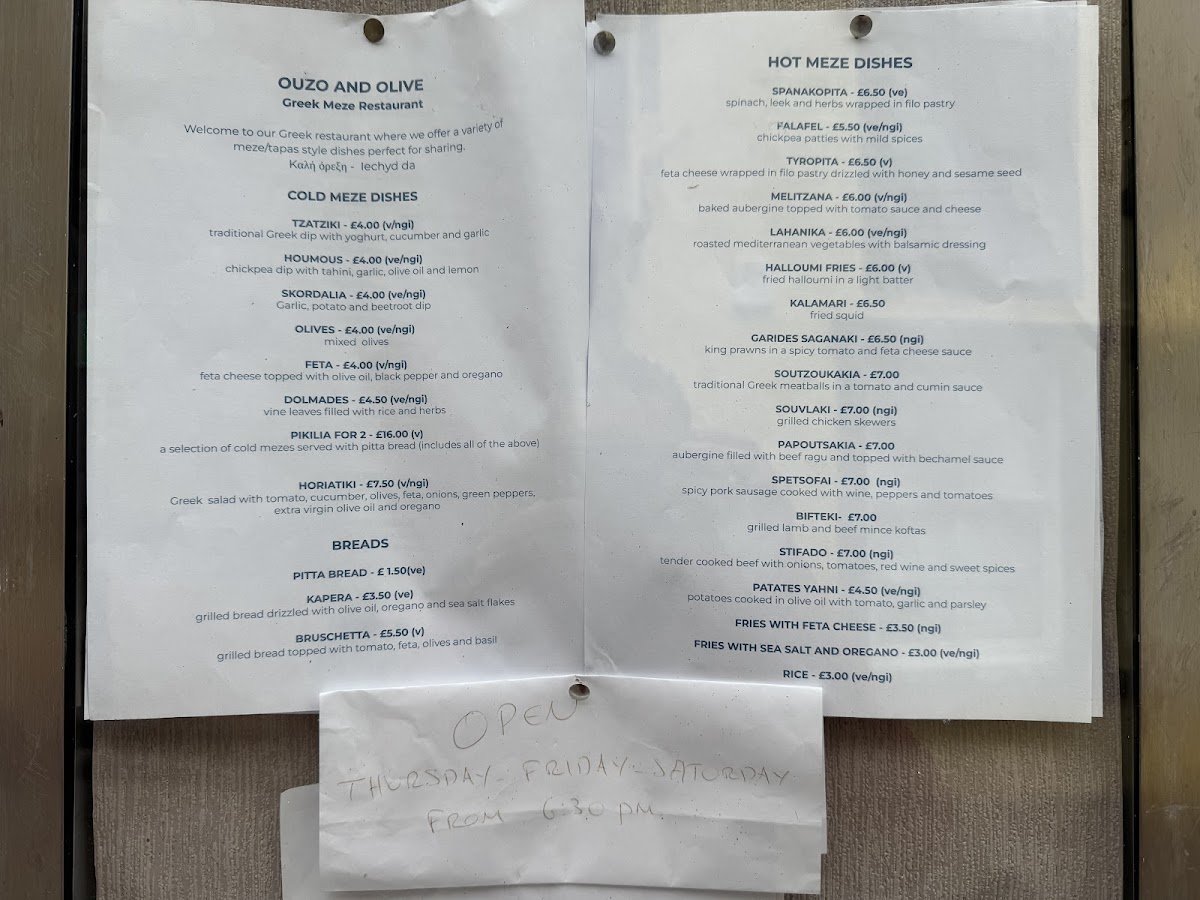 The menu at Ouzo & Olive offers a welcoming selection of traditional Greek and Mediterranean dishes, designed for sharing and savoring in a relaxed, friendly setting. It combines casual small plates and heartier options, making it ideal for everything from light lunches to leisurely evening meals.